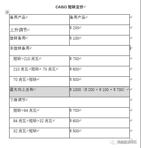 當(dāng)CAISO確定存在或?qū)⒋嬖谶\(yùn)營(yíng)備用不足時(shí),將觸發(fā)短缺定價(jià)機(jī)制,并且將根據(jù)CAISO的稀缺需求曲線中的適當(dāng)值設(shè)定運(yùn)營(yíng)備用的市場(chǎng)出清價(jià)格,詳見下表。