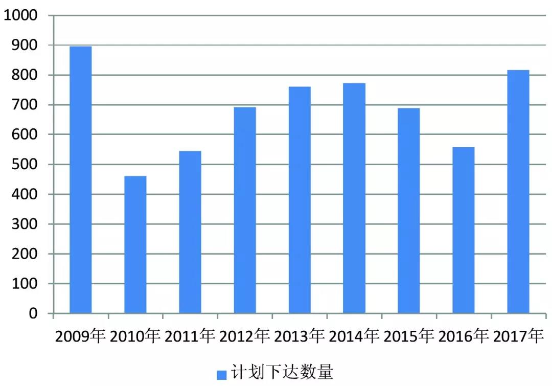 圖1 能源領(lǐng)域行業(yè)標準計劃項目(除核電)下達數(shù)量年度統(tǒng)計