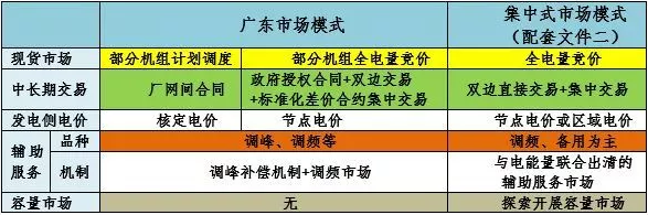 超級極簡版:廣東規(guī)則體系與《關(guān)于電力市場建設(shè)實施意見》(以下簡稱配套文件二)中集中式市場模式的主要描述對比如下表所示: