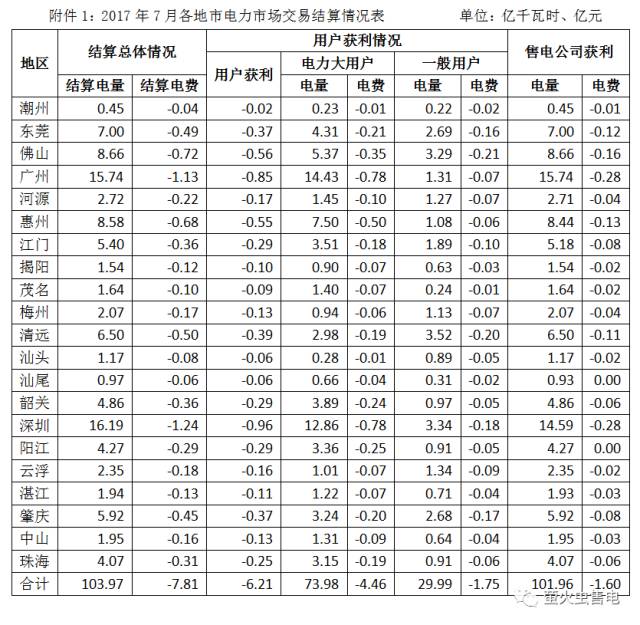 廣東電力交易中心發(fā)布了《關(guān)于2017年7月份廣東電力市場(chǎng)結(jié)算情況的通告》,相關(guān)內(nèi)容如下:1整體情況7月共有60家電廠(共69個(gè)交易單元)、8家大用戶、123家售電公司參與批發(fā)市場(chǎng)交易。全市場(chǎng)計(jì)劃用電量 104 20 億千