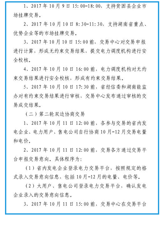 2017年9月26日,湖南電力交易中心發(fā)布《關(guān)于2017年電力市場(chǎng)交易的公告》,湖南電力交易市場(chǎng)正式啟動(dòng)。本次交易電量對(duì)應(yīng)的周期為2017年10月-2017年12月(分月),預(yù)計(jì)市場(chǎng)總量可達(dá)100億千瓦時(shí),但不設(shè)定總成交電量具