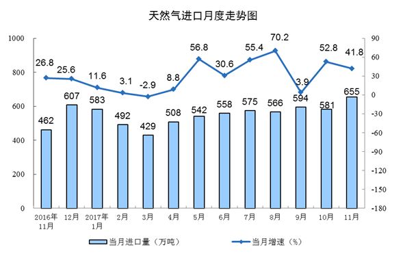 天然氣進(jìn)口快速增長(zhǎng)。11月份,進(jìn)口天然氣655萬噸,同比增長(zhǎng)41.8%,增速比10月份放緩11.0個(gè)百分點(diǎn)。1-11月份,進(jìn)口天然氣6070萬噸,同比增長(zhǎng)26.5%。