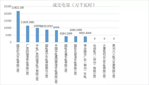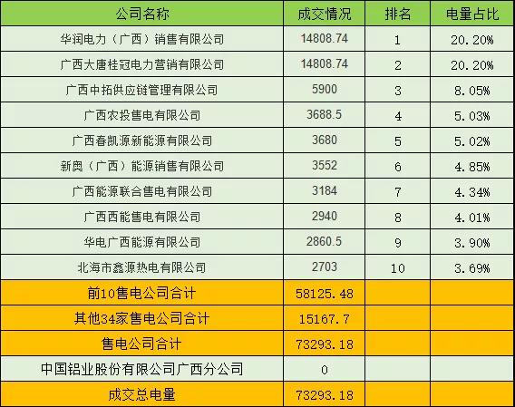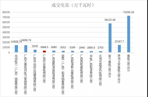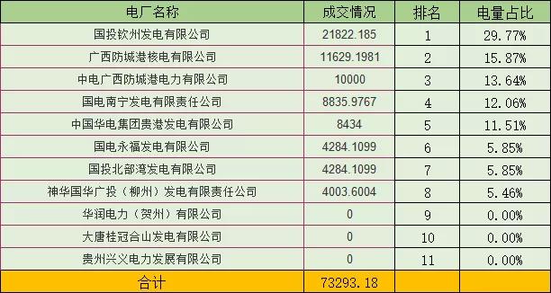 無約束成交電量為73293.18萬千瓦時,統(tǒng)一出清價格為38分/千瓦時。較廣西燃煤機組標桿上網電價42.07分/千瓦時下降4.07分/千瓦時。發(fā)電廠申報電量110994.2408萬千瓦時、用電企業(yè)申報電量73293.18萬千瓦時,供需比為1.51:1.0 , 呈供大于求狀態(tài)。