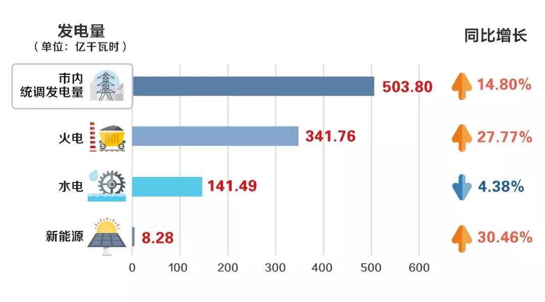 1~10月,市內(nèi)統(tǒng)調(diào)發(fā)電量503.80億千瓦時(shí),同比增長14.80%。其中,火電341.76億千瓦時(shí),同比增長27.77%;水電141.49億千瓦時(shí),同比下降4.38%;新能源8.28億千瓦時(shí),同比增長30.46%。