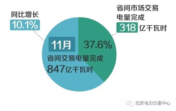 11月,省間交易電量完成847億千瓦時,同比增長10.1%。其中,省間市場交易電量完成318億千瓦時,占省間交易電量的37.6%。