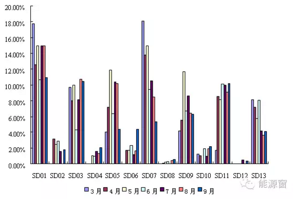 廣東省第一批售電公司在3月至9月7個(gè)月中每個(gè)月所占份額及平均份額如圖一、圖二所示,可以看到圖形“峰谷”起伏,表現(xiàn)差異很大啊!而且,還會(huì)驚奇地發(fā)現(xiàn)竟然代號(hào)為“單數(shù)”的公司表現(xiàn)都不錯(cuò)(純屬巧合啊),這些公司基本上都屬于區(qū)域性、“發(fā)電實(shí)力”很強(qiáng)的公司啊!在廣東注冊(cè)的五大電力集團(tuán)售電公司的表現(xiàn)還有待于“觀察”,觀察它們已在醞釀中的后期動(dòng)作!