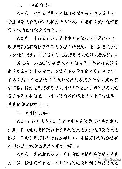上一年度已提交的發(fā)電權(quán)有償替代交易申請(qǐng)書(shū)仍然有效,今年新參加發(fā)電權(quán)交易的單位,請(qǐng)于12月9日前將《發(fā)電權(quán)有償替代交易申請(qǐng)書(shū)》(一式八份)提交至國(guó)網(wǎng)遼寧電力交易中心。