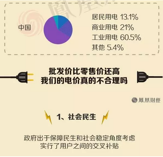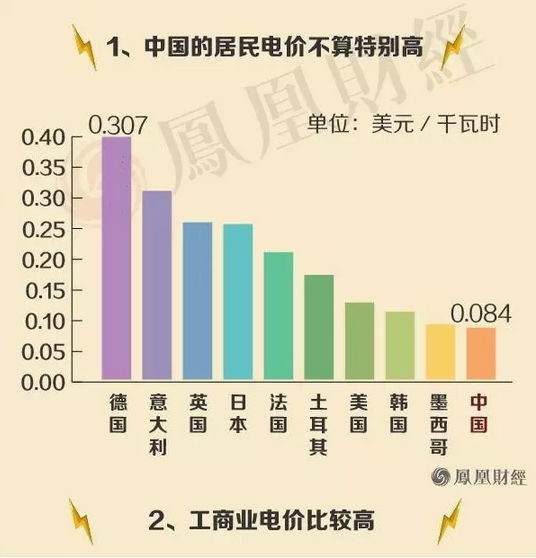 為什么企業(yè)家紛紛認(rèn)為中國(guó)的電價(jià)高?中國(guó)的電價(jià)高,高在哪?其實(shí)中國(guó)的居民電價(jià)不算特別高,工商業(yè)電價(jià)比較高。請(qǐng)看鳳凰財(cái)經(jīng)制作的圖表: