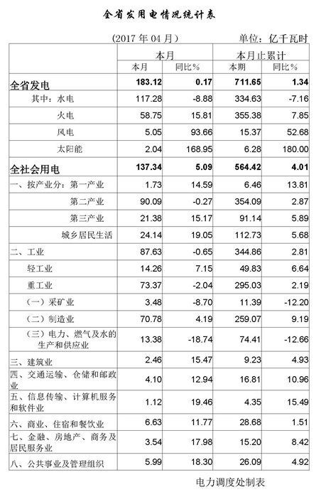 4月份,全省全社會用電量137.34億千瓦時,增長5.09%,其中工業(yè)用電87.63億千瓦時,下降0.65%。
