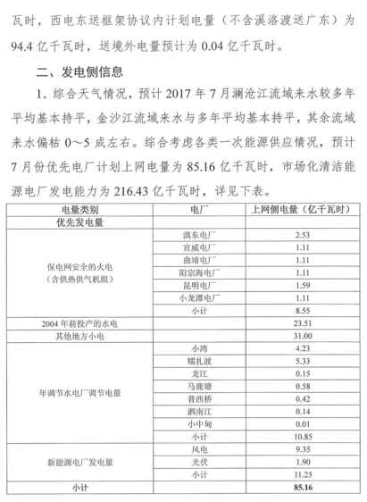 6月20日,昆明電力交易中心發(fā)布了《2017年7月電力市場(chǎng)化交易信息披露》,披露中稱,據(jù)測(cè)算,2017年7月市場(chǎng)總需求折算到電廠上網(wǎng)側(cè)預(yù)計(jì)為200.78億千瓦時(shí),同比增加5.68%。其中省內(nèi)市場(chǎng)用電需求預(yù)計(jì)為106.34億千瓦時(shí),西電東送框架協(xié)議內(nèi)計(jì)劃電量(不含溪洛渡送廣東)為94.4億千瓦時(shí),送境外電量預(yù)計(jì)為0.04億千瓦時(shí)。