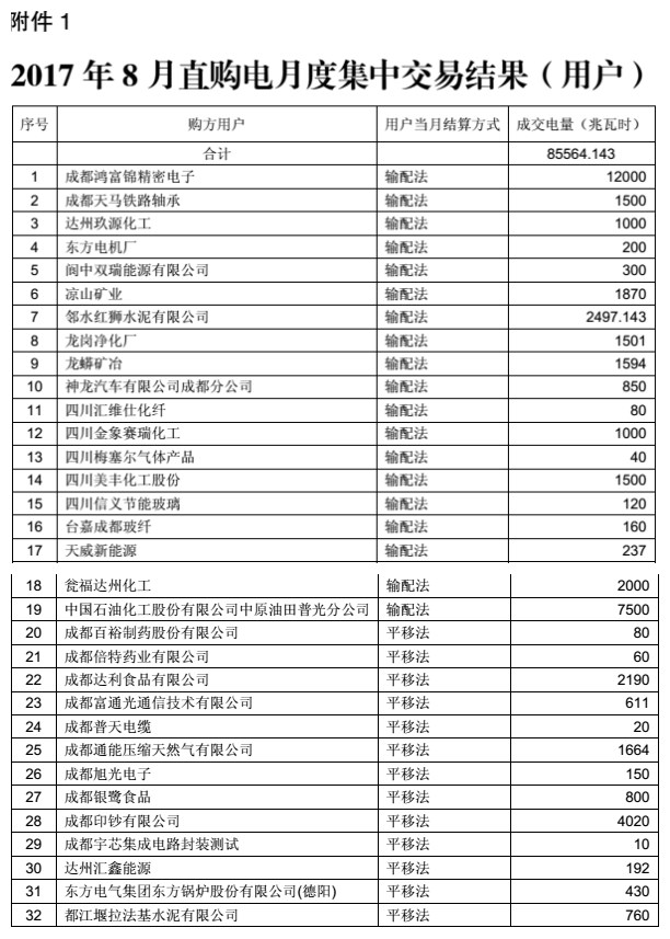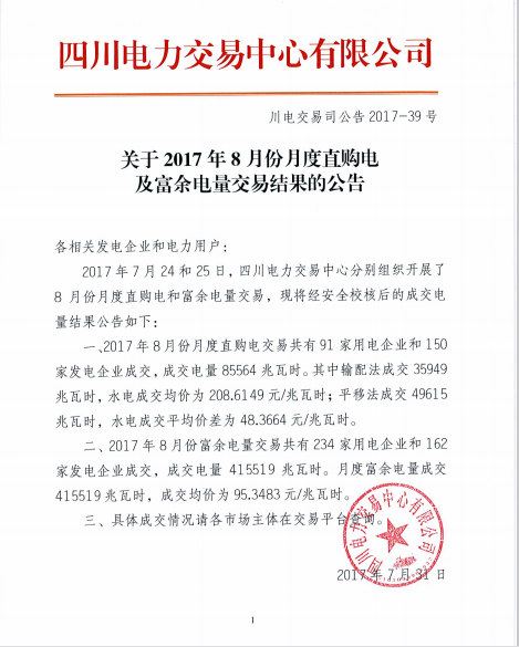 從四川電力交易中心獲悉,2017年7月24日和25日,四川電力交易中心分別組織開展了8月份月度直購電和富余電量交易。共有91家用電企業(yè)和150家發(fā)電企業(yè)成交,成交電量85564兆瓦時。具體公告如下:
