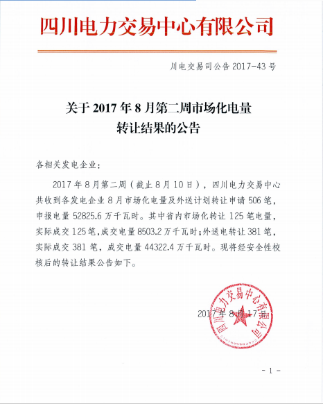 日前從四川電力交易中心獲悉,四川電力交易中心日前發(fā)布了關(guān)于2017年8月第二周市場(chǎng)化電量轉(zhuǎn)讓結(jié)果公告。截止8月第二周,四川電力交易中心共收到各發(fā)電企業(yè)8月市場(chǎng)化電量及外送計(jì)劃轉(zhuǎn)讓申請(qǐng)506筆,申報(bào)電量52825
