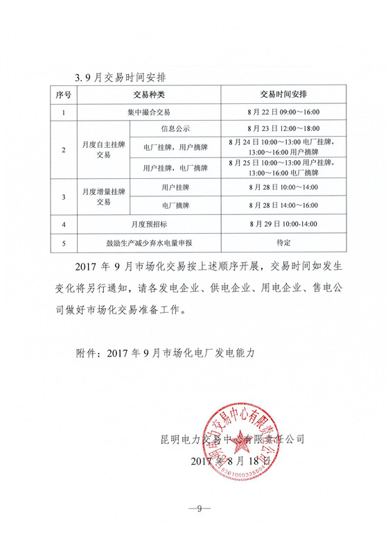 8月18日,昆明電力交易中心發(fā)布了2017年9月電力市場化信息披露,據(jù)測算,2017年9月市場總需求折算到電廠上網(wǎng)側預計為194.60億千瓦時。其中省內(nèi)市場用電需求預計為107億千瓦時,西電東送框架協(xié)議內(nèi)計劃電量(不含溪洛渡送廣東)為87.6億千瓦時。