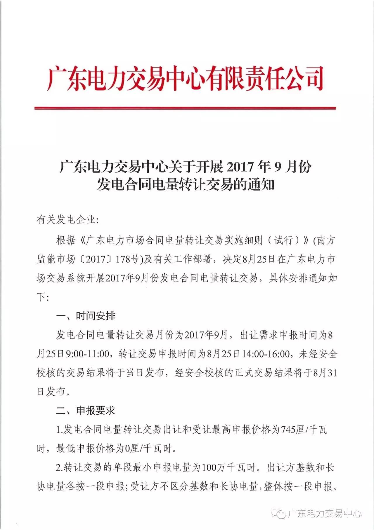 廣東電力交易中心日前發(fā)布了關(guān)于開展2017年9月份發(fā)電合同電量轉(zhuǎn)讓交易的通知。通知決定8月25日在廣東電力市場(chǎng)交易系統(tǒng)開展2017年9月份發(fā)電合同電量轉(zhuǎn)讓交易。具體通知如下: