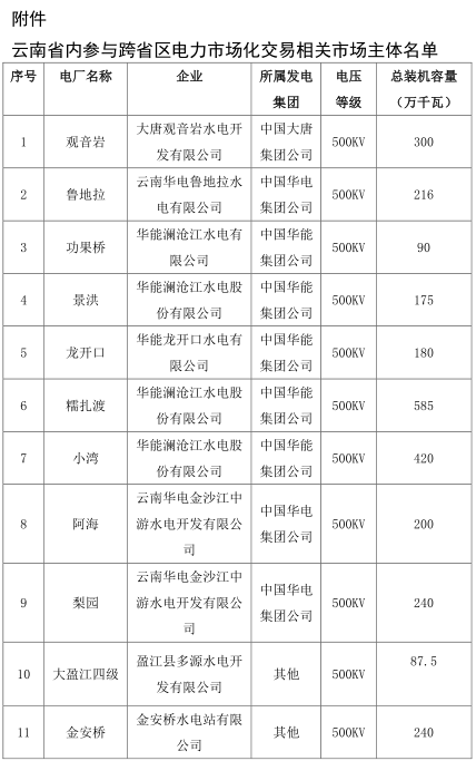 售電方:根據(jù)《南方區(qū)域跨區(qū)跨省月度電力交易規(guī)則(試行)》(廣州交易〔2017〕65號(hào),以下簡(jiǎn)稱交易規(guī)則)并結(jié)合云南政府相關(guān)部門意見(jiàn),初期為云南14家水電廠,具體名單見(jiàn)附件。