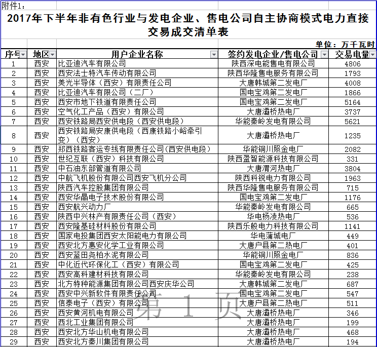 附件:1.2017年下半年非有色行業(yè)與發(fā)電企業(yè)、售電公司自主協(xié)商模式電力直接交易成交清單表