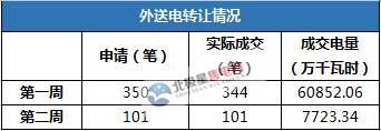 外送電轉(zhuǎn)讓101筆,實際成交101筆,成交電量7723.34萬千瓦時,比第一周外送電轉(zhuǎn)讓減少239筆,實際成交減少243,交易電量減少53126.72萬千瓦時。