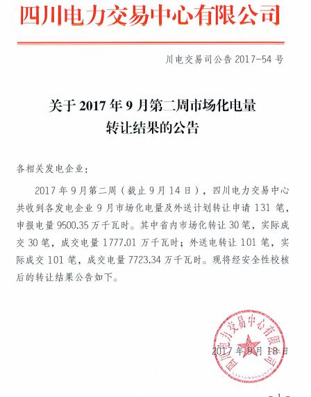 2017年9月18日,四川電力交易中心發(fā)布了9月第二周(截至9月14日)市場化電量轉(zhuǎn)讓公告。2017年9月第二周,四川電力交易中心共收到各發(fā)電企業(yè)9月市場化電量外送計劃轉(zhuǎn)讓申請131筆,申報電量9500 35萬千瓦時,比第一