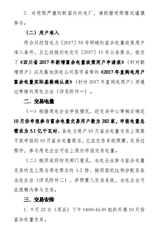 2017年9月21日四川電力交易中心發(fā)布《關(guān)于開展2017年10月富余電量交易的公告》。9月22日(周五)下午14:00-16:30組織開展10月份富余電量交易。根據(jù)用電企業(yè)申報(bào)情況,經(jīng)交易中心審核后確定10月份申報(bào)參與富余電量