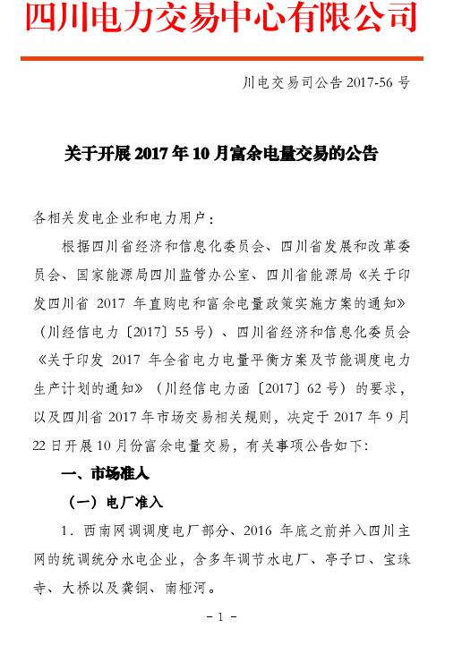 四川開展2017年10月富余電量交易