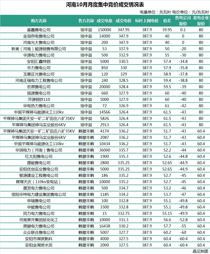 相比之下,10月的集中撮合交易的成交價(jià)差要比上一次的高多了。難道這些成交電量少的售電公司是在用小電量來(lái)試探更高的價(jià)差。這么問(wèn)題來(lái)了,怎么成交電量大的售電公司和用戶也把價(jià)差報(bào)得這么高,就不怕不成交造成這個(gè)月偏差很大嗎?而且河南這個(gè)月的交易可能就只有這一次集中撮合交易了。
