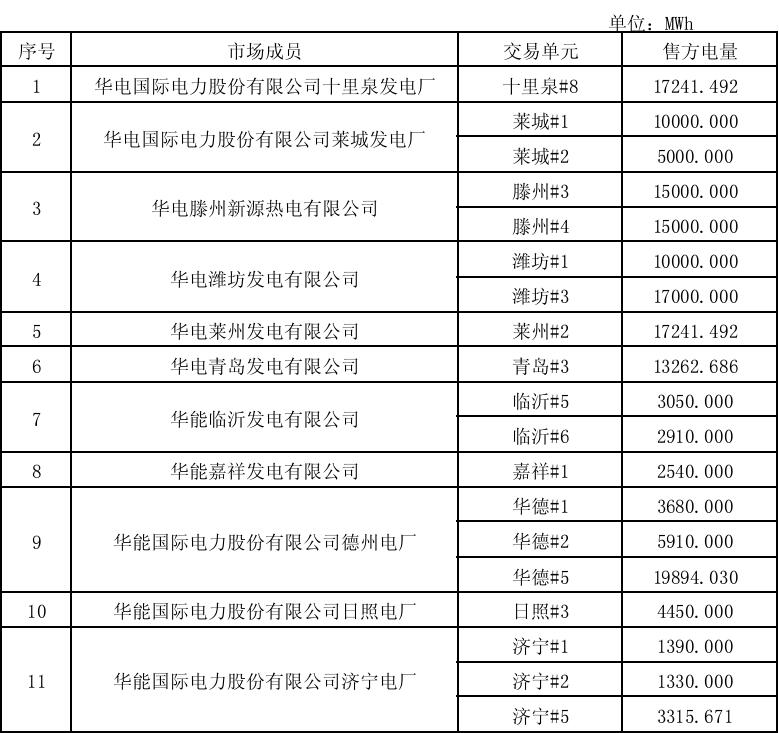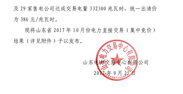 山東2017年10月份電力直接交易(集中競價)達成交易電量332300兆瓦時