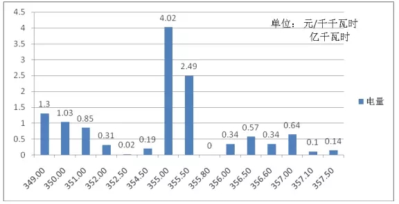 冀北統(tǒng)調(diào)15家發(fā)電企業(yè)參與交易,成交均價為355.53元/千千瓦時,成交價最高為356.42元/千千瓦時,成交價最低為355.04元/千千瓦時。區(qū)內(nèi)電廠(含張家口電廠、王灘電廠)成交電量電價區(qū)間如下:
