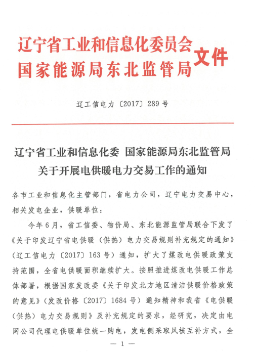 其他相關(guān)事宜按照《遼寧省工業(yè)和信息化委員會、國家能源局東北監(jiān)管局關(guān)于開展電供暖電力交易工作的通知》(遼工信電力[2017]289號)執(zhí)行。