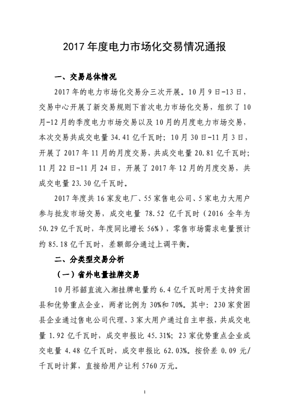 湖南2017年度電力市場化交易情況通報:成交電量78.52億千瓦時