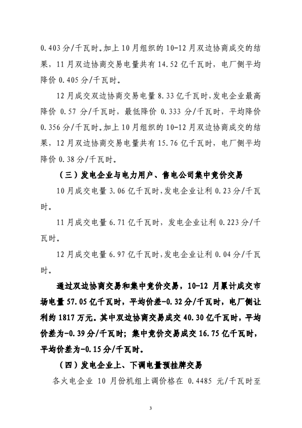 通過雙邊協(xié)商交易和集中競價交易,10-12月累計成交市場電量57.05億千瓦時;集中競價交易成交16.75億千瓦時。原文如下: