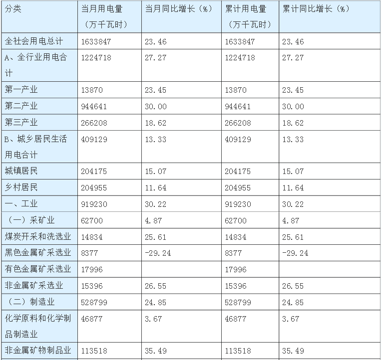 各行業(yè)用電量當(dāng)月及累計(jì)增長(zhǎng)情況具體見下表: