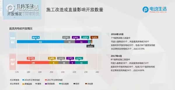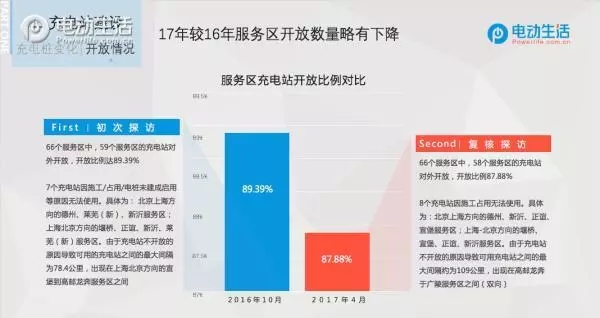 2016年10月初次探訪,66個服務(wù)區(qū)中有59個服務(wù)區(qū)的充電站對外開放,開放比例達89.39%,2017年4月二次探訪時有58個服務(wù)區(qū)的充電站對外開放,開放比例為87.88%,略有下降。