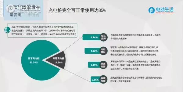2016年10月第一次走訪時65個可進入服務(wù)區(qū)共設(shè)260個直流充電樁,除6個因施工占用或未通電啟用的充電站以外,實際開放的59個充電站中共有236個直流快充樁。這其中離網(wǎng)10臺,系統(tǒng)故障11臺,槍頭故障2臺,損壞1臺,未結(jié)算1臺,共計有25臺電樁出現(xiàn)異常狀況占比10.59%。2017年04月第二次走訪時,有8個服務(wù)區(qū)存在施工占用的情況,實際開放的58個服務(wù)區(qū)中共有232臺直流快充樁。這其中,因屏幕故障的8臺,離網(wǎng)10臺,系統(tǒng)故障5臺,槍頭故障11臺,共有34臺電樁出現(xiàn)了異常狀況占比14.66%。