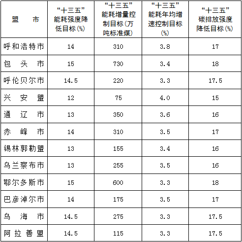各盟市“十三五”能耗總量和強度“雙控”及碳排放強度降低目標