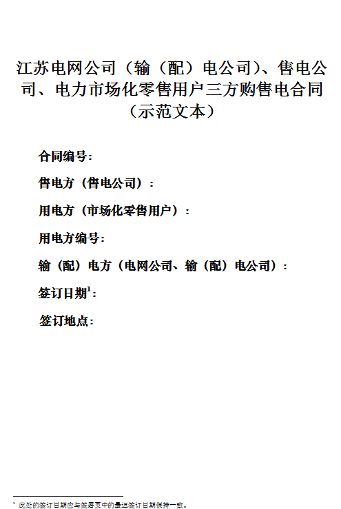 國(guó)家能源局江蘇監(jiān)管辦日前發(fā)布了《售電公司與電力用戶購(gòu)售電合同(示范文本)》《江蘇電網(wǎng)公司(輸配電公司)、售電公司、電力市場(chǎng)化零售用戶三方購(gòu)售電合同(示范文本)》。各有關(guān)單位要在開展電力用戶直接交易工作時(shí)