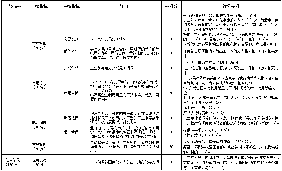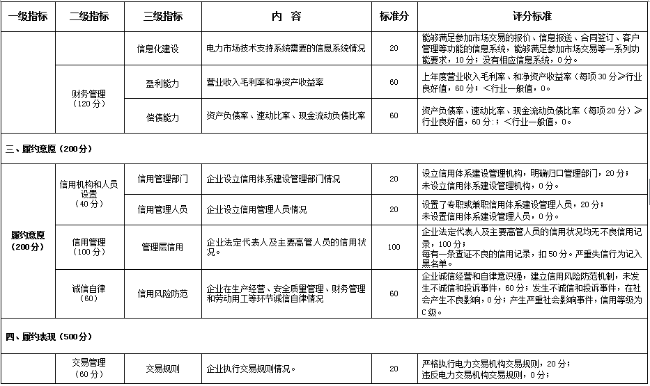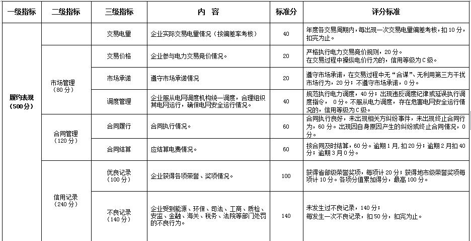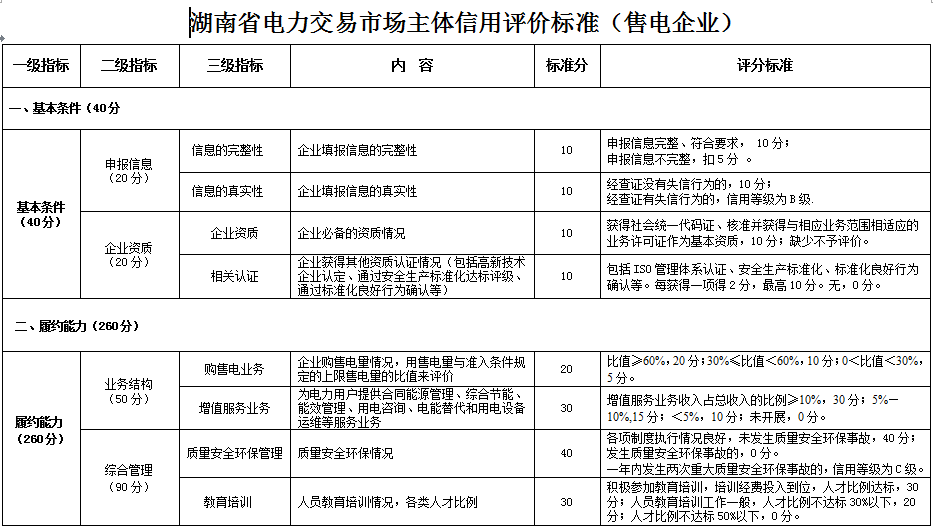 湖南省經(jīng)信委日前發(fā)布了關(guān)于征求《湖南省電力交易市場(chǎng)主體信用評(píng)價(jià)管理工作暫行辦法》(征求意見(jiàn)稿),辦法中包含電力用戶、售電公司和發(fā)電企業(yè)的信用評(píng)價(jià)標(biāo)準(zhǔn)?!缎庞迷u(píng)價(jià)標(biāo)準(zhǔn)》根據(jù)各市場(chǎng)主體市場(chǎng)功能不同,分