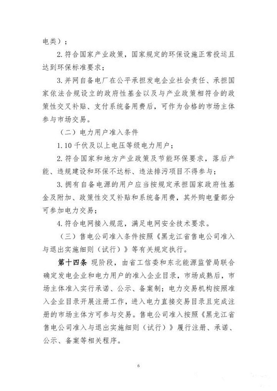 國家能源局東北監(jiān)管局、黑龍江省工信委、黑龍江省發(fā)改委、黑龍江省物價局日前聯(lián)合發(fā)布了《《黑龍江省電力中長期交易規(guī)則(暫行)的通知》,通知中稱,規(guī)則于2017年11月1日起施行。電力用戶的準(zhǔn)入條件為10千伏及以上