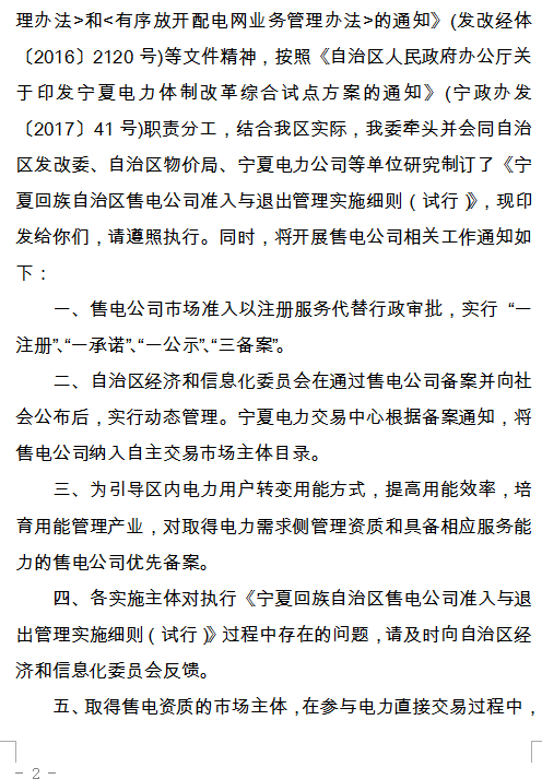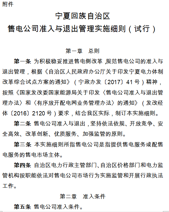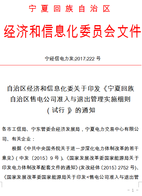 寧夏自治區(qū)經(jīng)信委日前發(fā)布了《寧夏回族自治區(qū)售電公司準(zhǔn)入與退出管理實(shí)施細(xì)則(試行)的通知》。