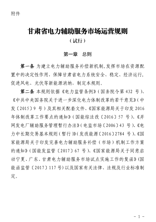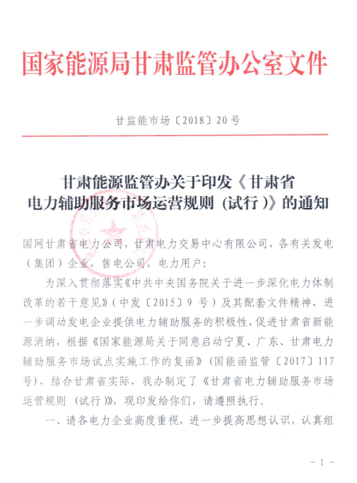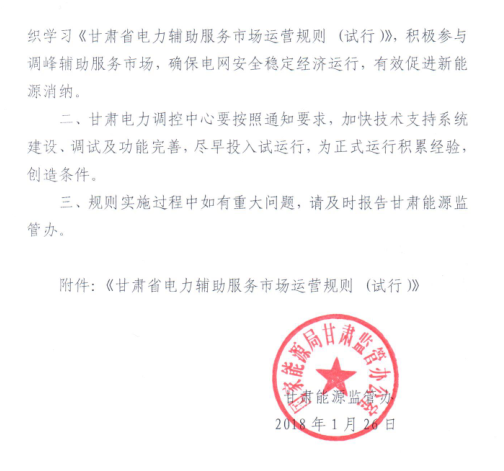 近日,國家能源局甘肅監(jiān)管辦發(fā)布了《甘肅省電力輔助服務(wù)市場運(yùn)營規(guī)則(試行)》通知。