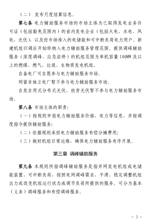 電力輔助服務(wù)市場的市場主體為已取得發(fā)電業(yè)務(wù)許可證的省內(nèi)發(fā)電企業(yè)(包括火電、水電、風(fēng)電、光伏),新建機(jī)組歸調(diào)后開始即納入電力輔助服務(wù)管理范圍。提供調(diào)峰輔助服務(wù)(深度調(diào)峰、應(yīng)急啟停)的機(jī)組范圍為單機(jī)容量100MW及以上的燃煤、燃?xì)?、垃圾、生物質(zhì)發(fā)電機(jī)組。 自備電廠可自愿參與電力輔助服務(wù)市場。