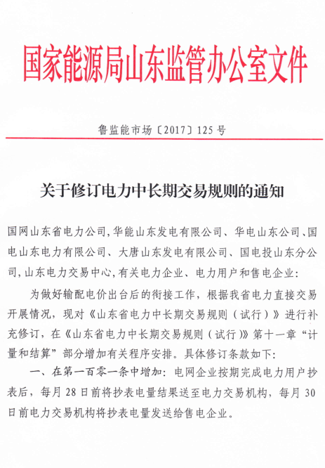 《山東省電力中長期交易規(guī)則》修訂增加4條規(guī)則