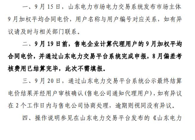 9月19日前,售電企業(yè)計算代理用戶的9月加權平均合同電價,并通過山東電力交易平臺系統(tǒng)完成申報,8月偏差考核費用已結算完畢,此次不需填報。