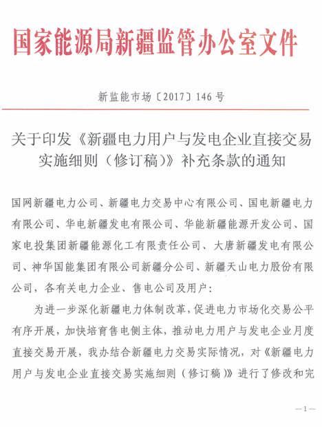 新疆電力用戶與發(fā)電企業(yè)直接交易實施細則的補充條款發(fā)布