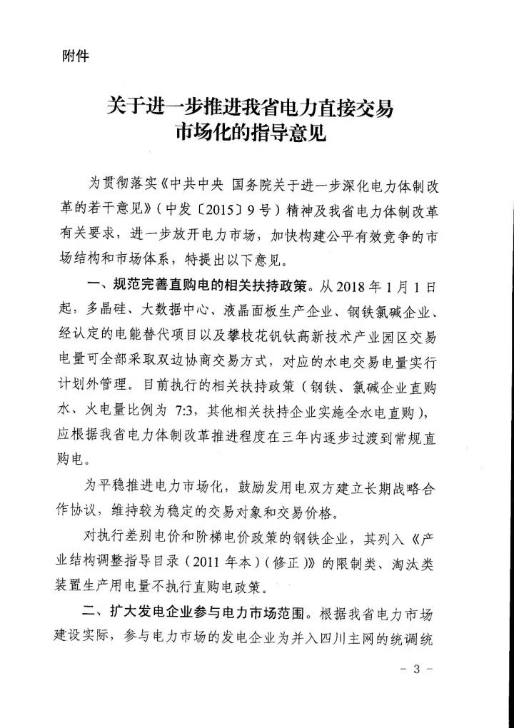 四川省經(jīng)信委、四川省發(fā)改委、國(guó)家能源局四川監(jiān)管辦、四川省能源局日前聯(lián)合下發(fā)了《關(guān)于進(jìn)一步推進(jìn)我省電力直接交易市場(chǎng)化的指導(dǎo)意見》。意見中稱,將規(guī)范完善直購(gòu)電的相關(guān)扶持政策,擴(kuò)大發(fā)電企業(yè)參與電力市場(chǎng)范圍,全面放開售電公司參與電力市場(chǎng),穩(wěn)步推進(jìn)進(jìn)商業(yè)用戶進(jìn)入電力市場(chǎng),積極開展產(chǎn)業(yè)園區(qū)直接交易試點(diǎn),穩(wěn)妥開展跨省跨區(qū)富余可再生能源電力現(xiàn)貨交易試點(diǎn),放開地方電網(wǎng)(躉售區(qū))進(jìn)入直接交易市場(chǎng),有序推進(jìn)其他特殊行業(yè)企業(yè)完全電力市場(chǎng)化。詳情如下:
