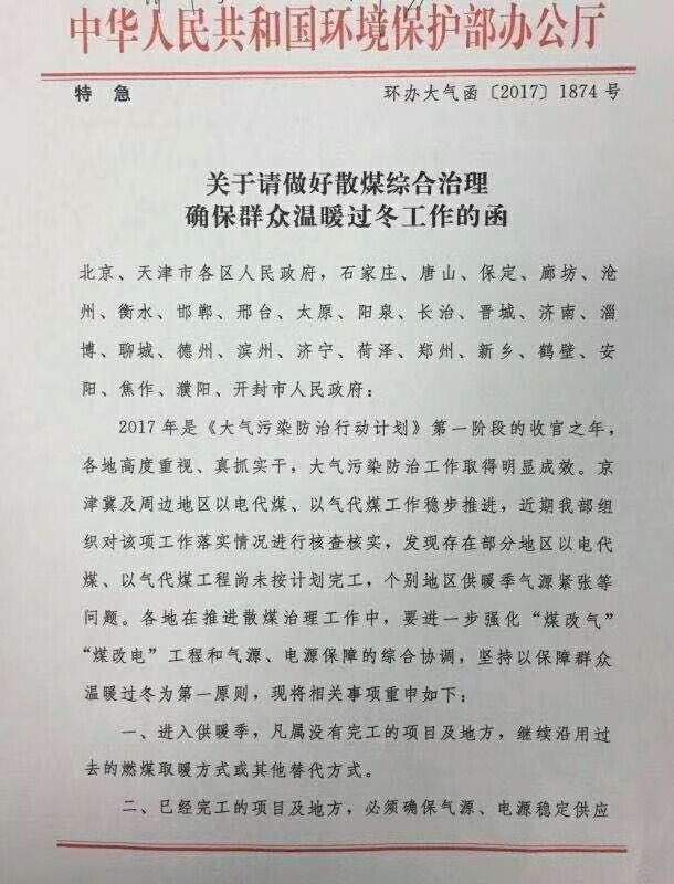 12月7日,從環(huán)保部權(quán)威信源處獲悉,環(huán)保部已于12月4日向京津冀及周邊地區(qū)“2+26”城市下發(fā)《關(guān)于請(qǐng)做好散煤綜合治理確保群眾溫暖過(guò)冬工作的函》特急文件,提出堅(jiān)持以保障群眾溫暖過(guò)冬為第一原則,“進(jìn)入供暖季,凡屬?zèng)]有完工的項(xiàng)目或地方,繼續(xù)沿用過(guò)去的燃煤取暖方式或其他替代方式”。