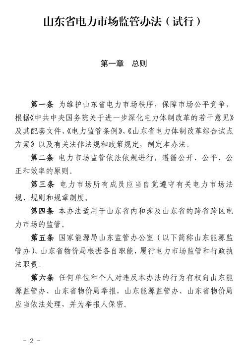 國(guó)家能源局山東監(jiān)管辦、山東省物價(jià)局日前發(fā)布了《山東省電力市場(chǎng)監(jiān)管辦法(試行)》。辦法適用于山東省內(nèi)和涉及山東省的跨省跨區(qū)電力市場(chǎng)的監(jiān)管。