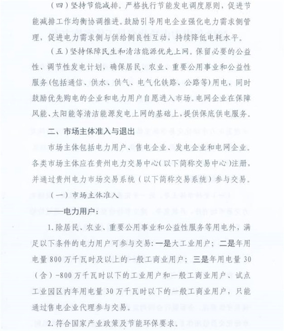 貴州省經(jīng)信委、國家能源局貴州監(jiān)管辦日前聯(lián)合發(fā)布了《關(guān)于印發(fā)2018年度電力市場化交易工作實施方案》。電力用戶的準(zhǔn)入:大工業(yè)用戶、年用電量800萬千瓦時及以上的一般工商業(yè)用戶、年用電量30(含)-800萬千瓦時的