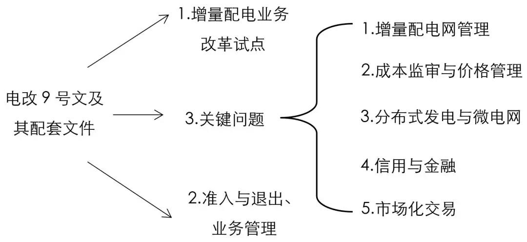 2018年國(guó)家發(fā)改委、國(guó)家能源局等部門編制印發(fā)了一系列增量配電改革相關(guān)政策,基本建立了增量配電改革的政策體系。該體系以“中發(fā)9號(hào)文及其配套文件”為龍頭,以“售電公司準(zhǔn)入與退出及增量配電網(wǎng)業(yè)務(wù)管理”和“增量配電業(yè)務(wù)改革試點(diǎn)相關(guān)政策”為骨干,以“增量配電網(wǎng)管理相關(guān)政策”、“成本監(jiān)審與價(jià)格管理”、“分布式發(fā)電與微電網(wǎng)”、“信用與金融”、“市場(chǎng)化交易”為關(guān)鍵的政策體系。