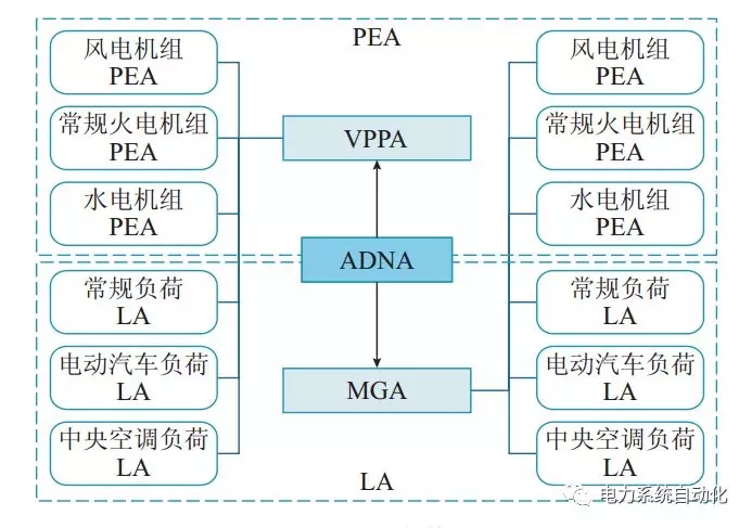 在此背景下,主動配電網(wǎng)多智能體系統(tǒng)包含核心協(xié)調(diào)層(ADNA)、直接協(xié)調(diào)層(VPPA與MGA)、間接協(xié)調(diào)層(微網(wǎng)內(nèi)PEAs、LAs),如圖2所示。處于上層的智能體對下層進(jìn)行電價激勵,處于下層的智能體對上層電價進(jìn)行功率響應(yīng),這一多層電價響應(yīng)機(jī)制保證了不同層級智能體間利益協(xié)調(diào)的有序進(jìn)行,原理類似于有序的多層規(guī)劃。