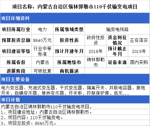 廣東省惠州市220千伏數(shù)碼園輸變電項(xiàng)目、內(nèi)蒙古自治區(qū)巴彥淖爾市220kV輸變電項(xiàng)目、內(nèi)蒙古自治區(qū)錫林郭勒市110千伏輸變電項(xiàng)目、新疆維吾爾族自治區(qū)110千伏輸變電項(xiàng)目、福建省龍巖市110kV變2號(hào)主變擴(kuò)建輸變電項(xiàng)目、山西省臨沂市110kV輸變電項(xiàng)目。最高項(xiàng)目總投資達(dá)14441萬(wàn)元。